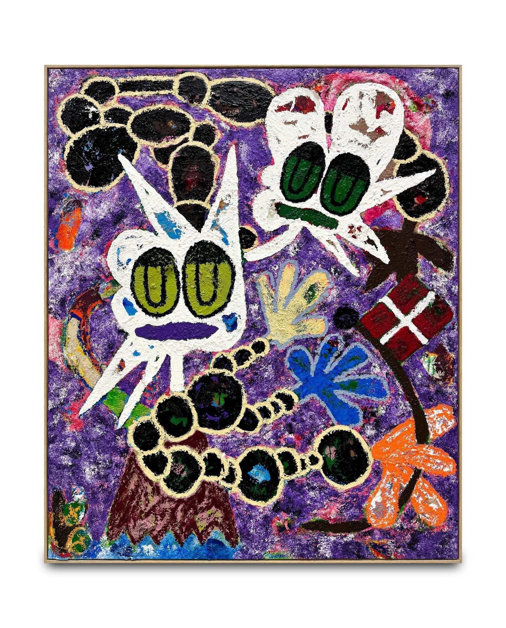 acrylic, oilsticks, spraypaint, sand and paper on canvas