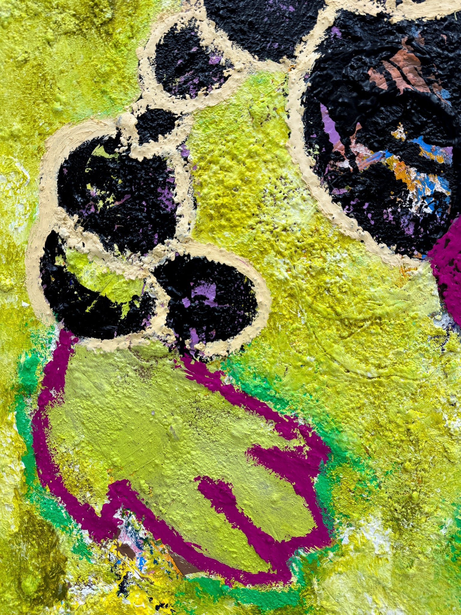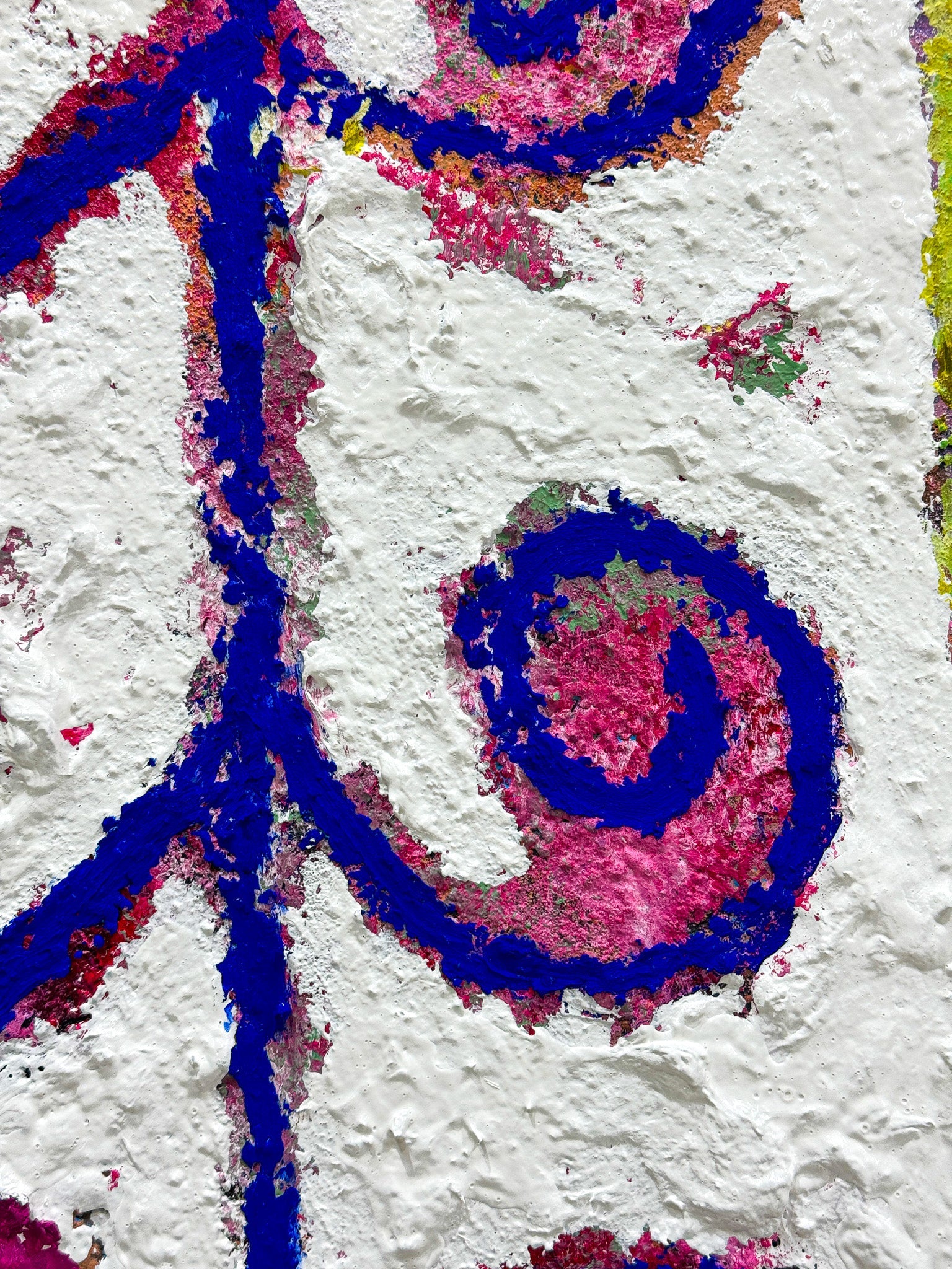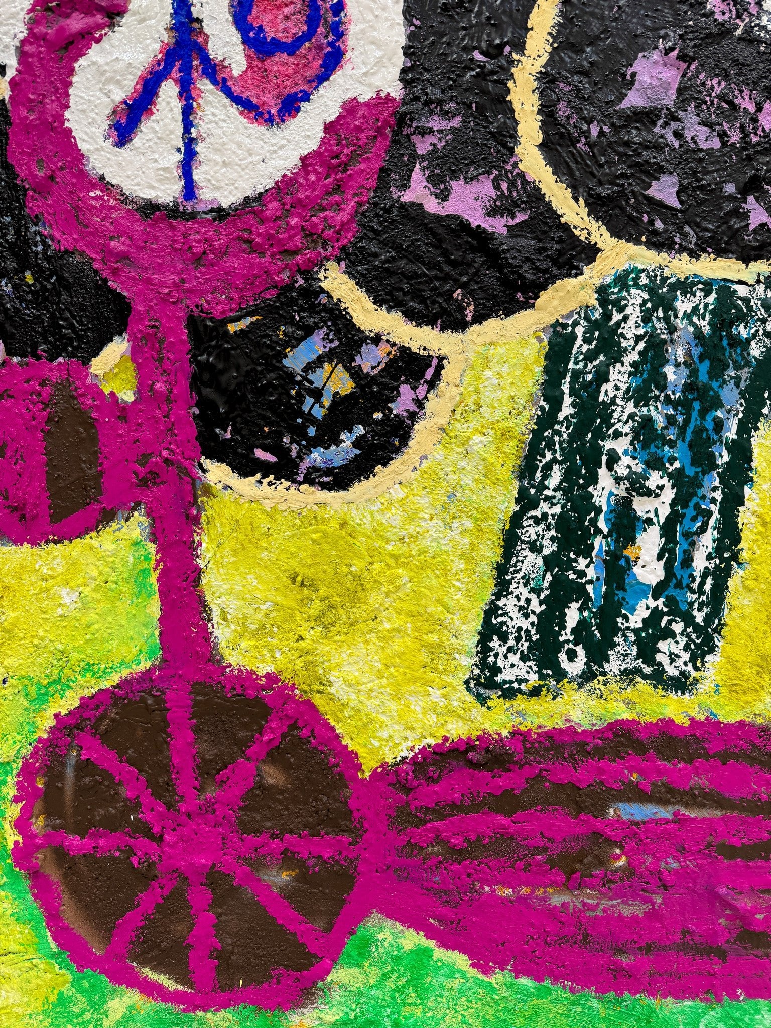 acrylic, oilsticks, spraypaint, sand and paper on canvas