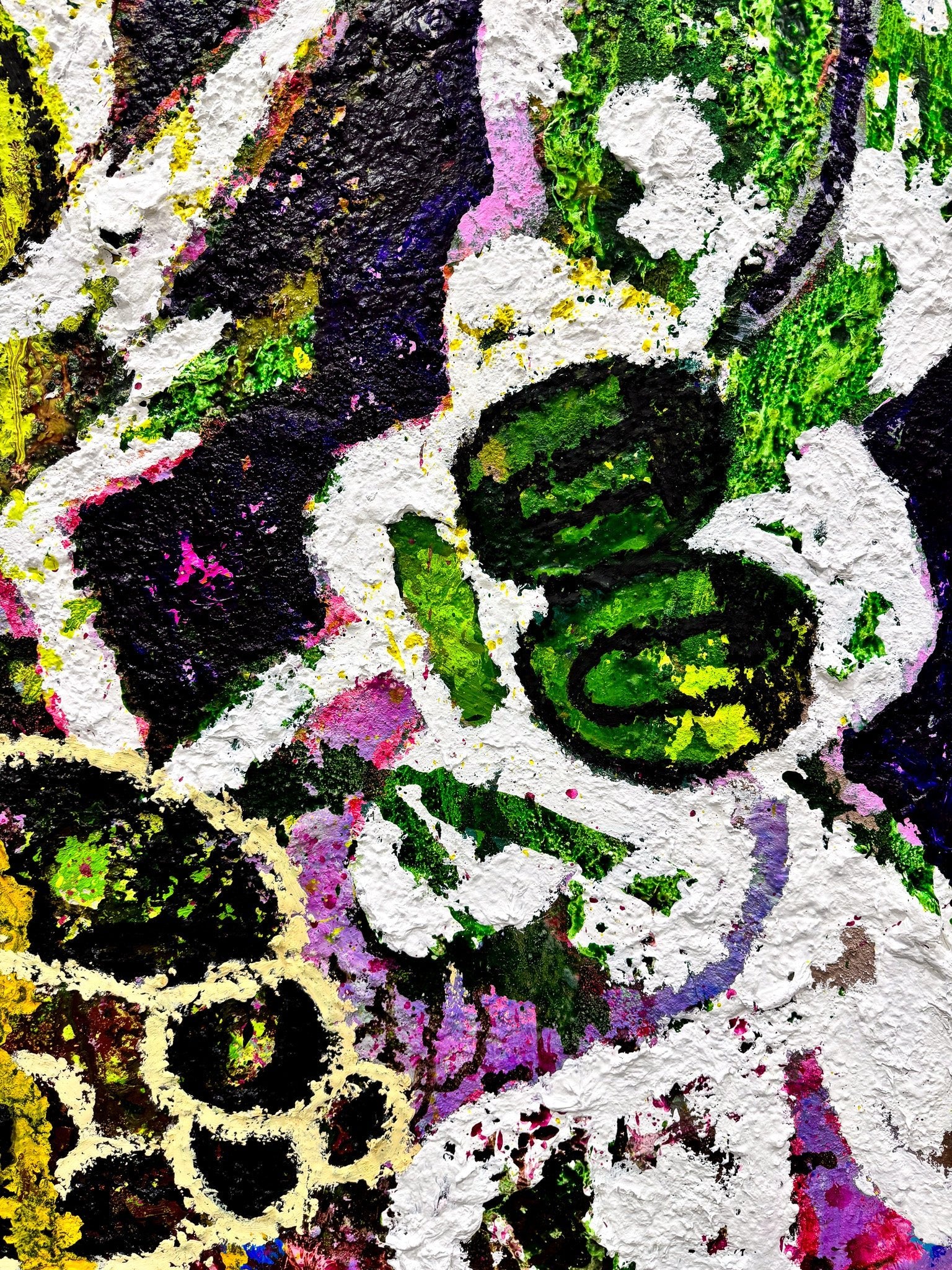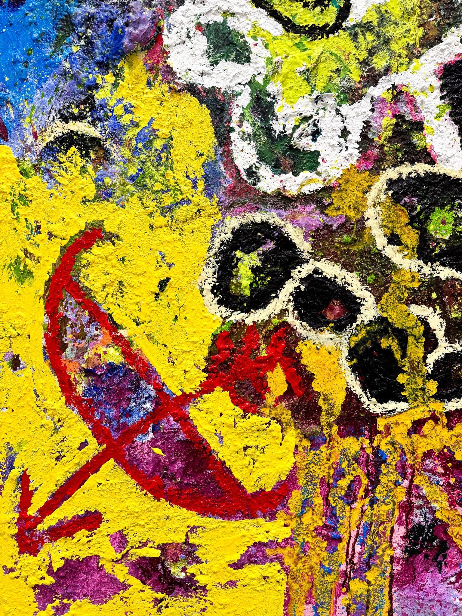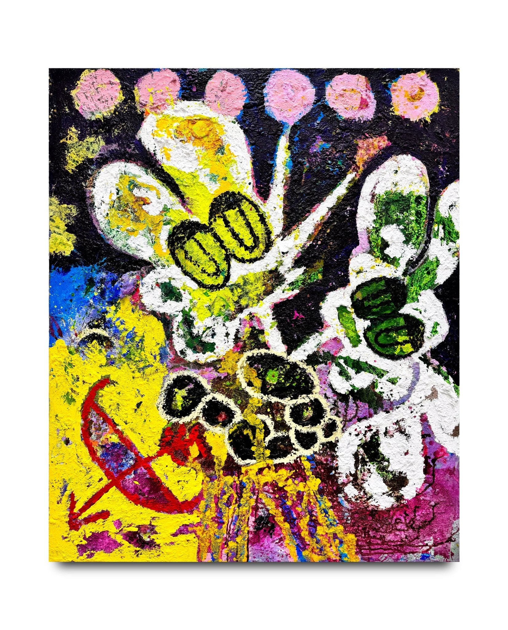 acrylic, oilsticks, spraypaint, sand and paper on canvas